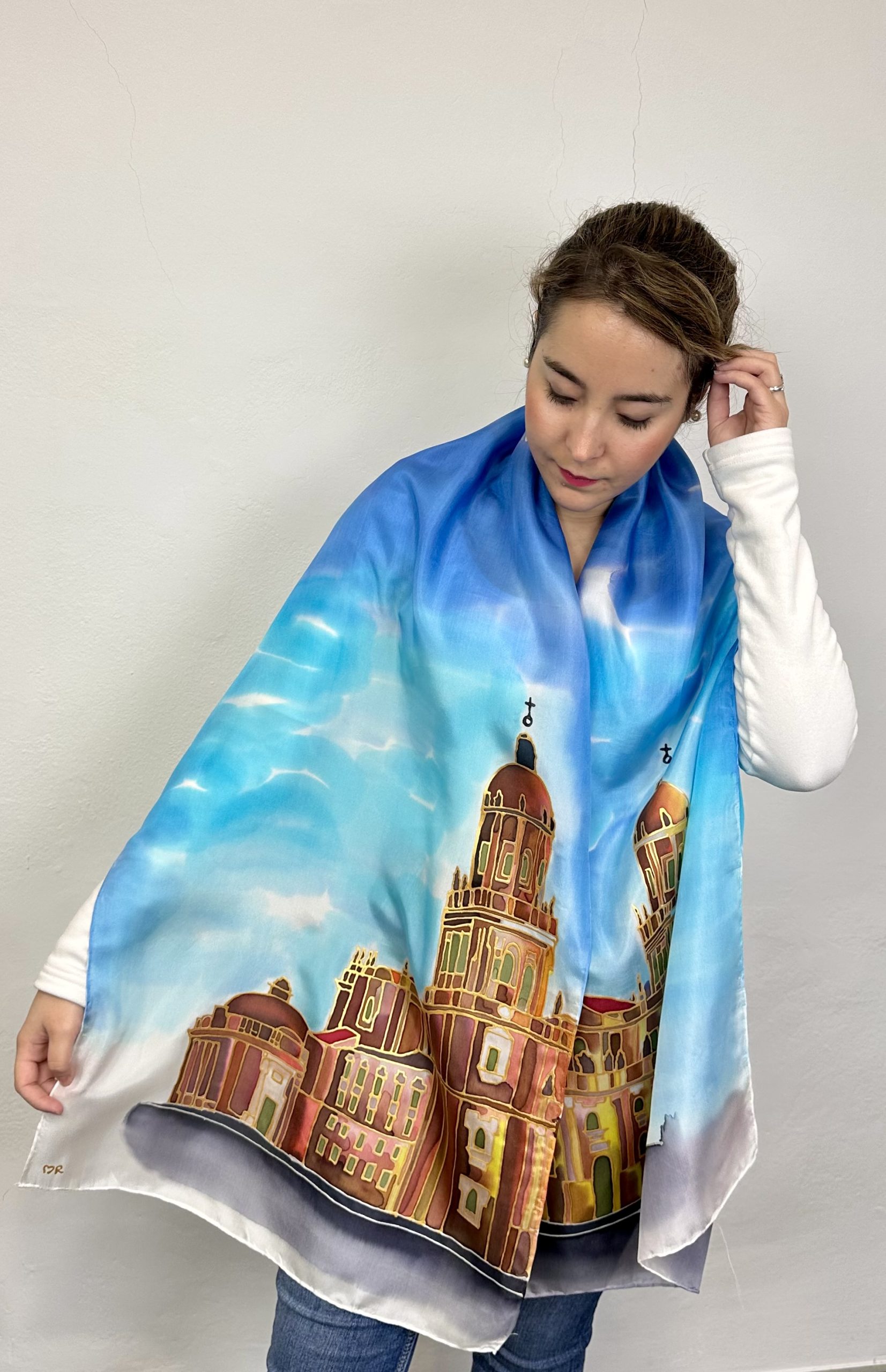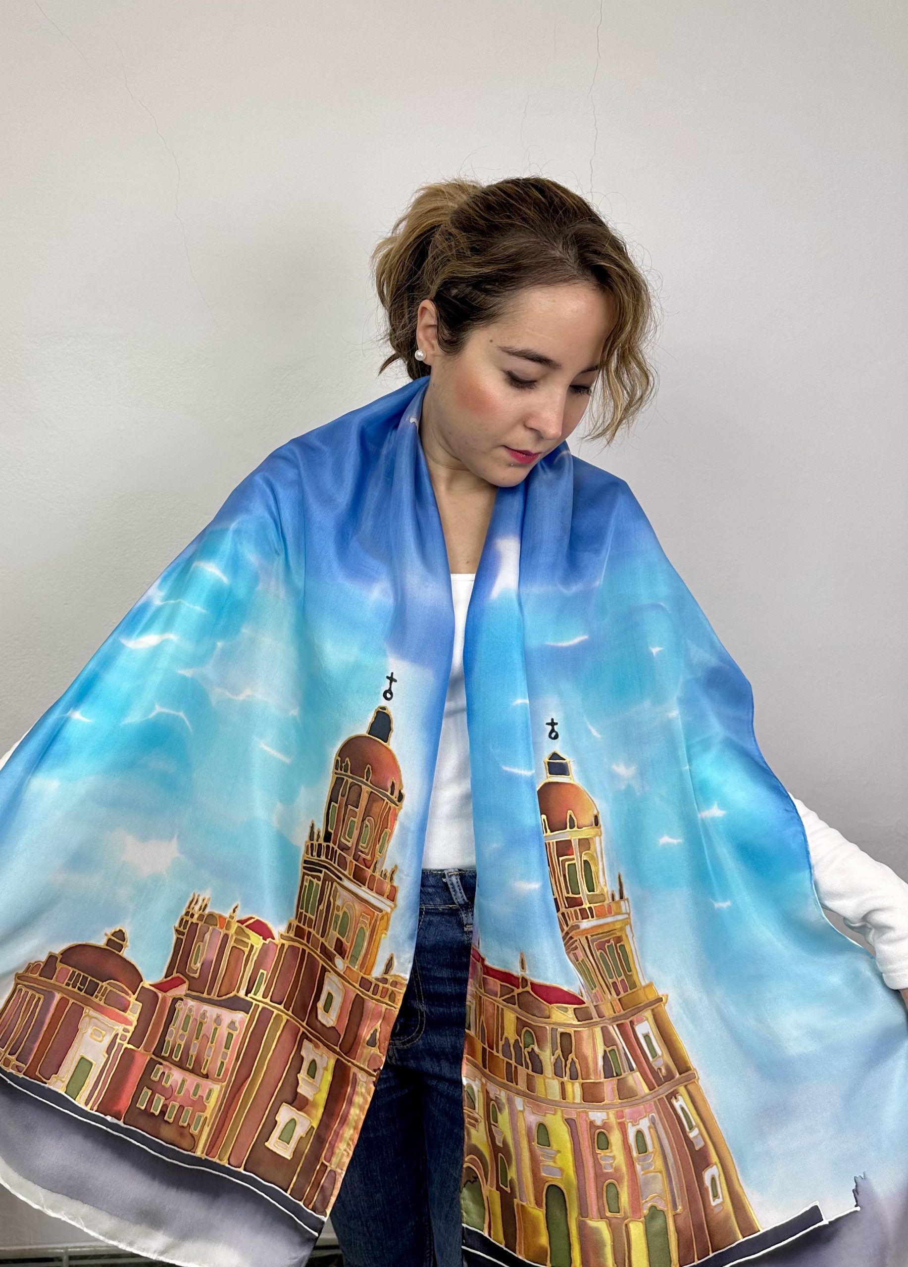 Combinar un fular de seda pintado a mano que tiene dibujada la catedral de Jaén puede ser una tarea encantadora, ya que este accesorio es una pieza única y elegante con la que puedes hacer un guiño a la Ciudad del Santo Reino.