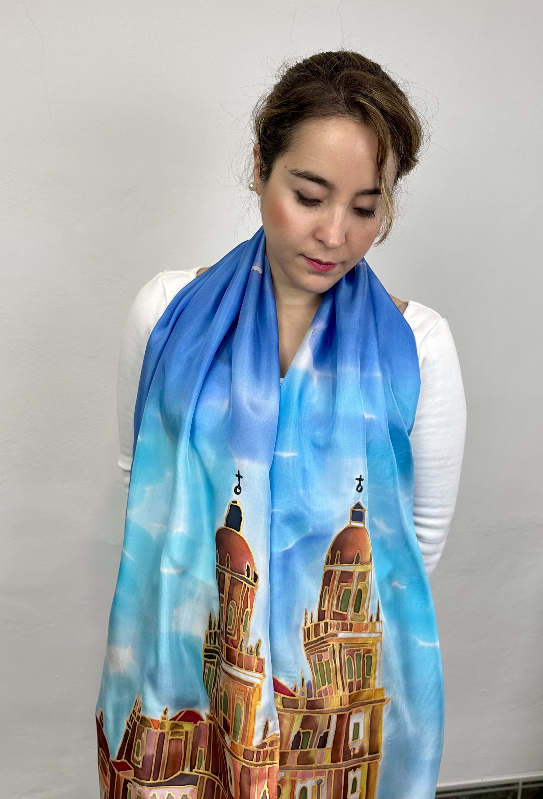 El fular de Seda Catedral de Jaén lo hemos diseñado y pintado a mano utilizando tonos haciendo alusión al concepto con el que se conoce a este templo “Catedral de la luz”. En la parte del fondo observamos un cielo azul con algunas nubes.