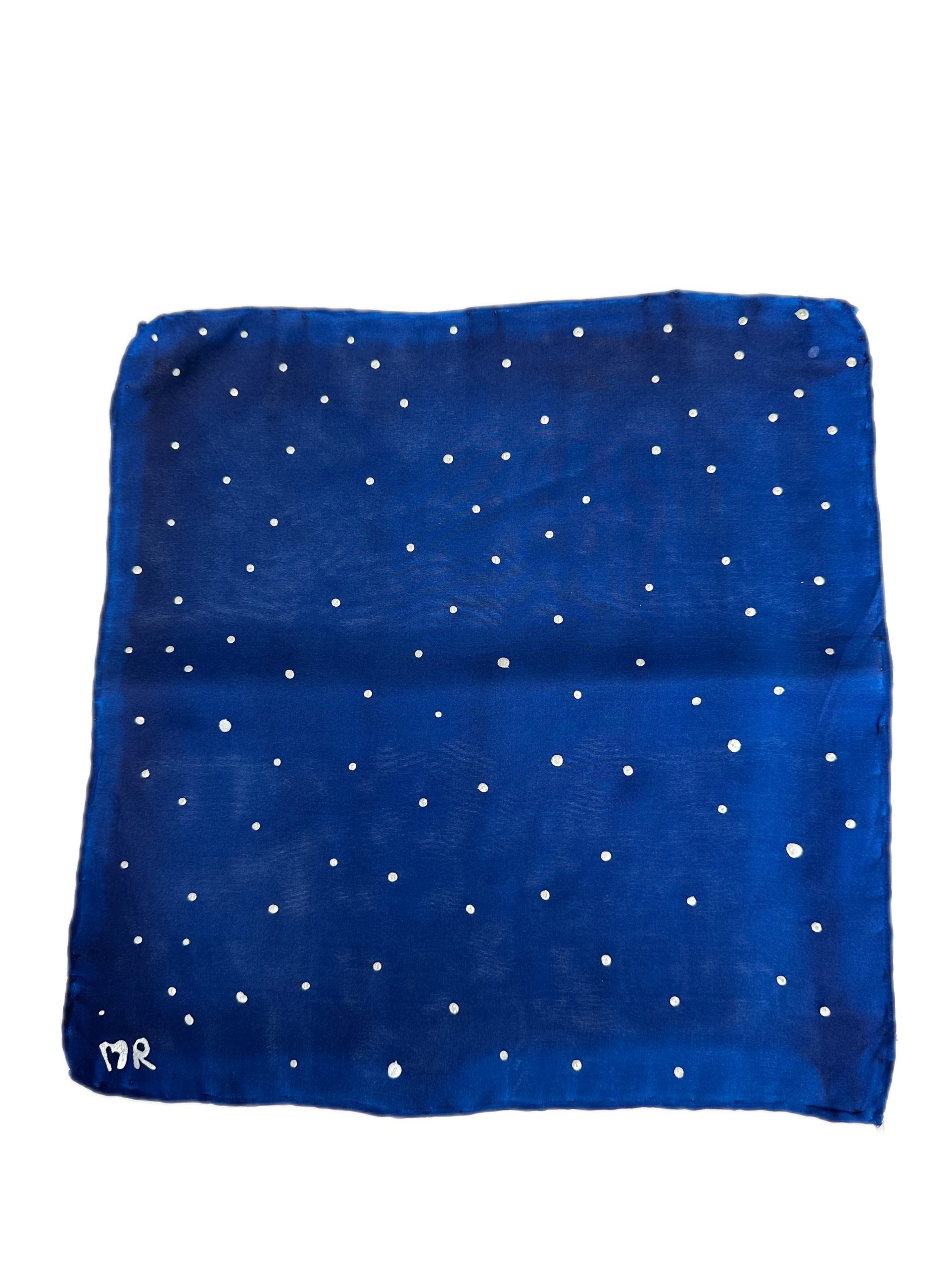 Estrellas Marino es un pañuelo de seda natural pintado a mano, diseñado para caballero y pensado para el bolsillo de chaquetas y americanas. Su fondo azul marino aporta elegancia, mientras los puntitos plateados crean un toque sofisticado y discreto.