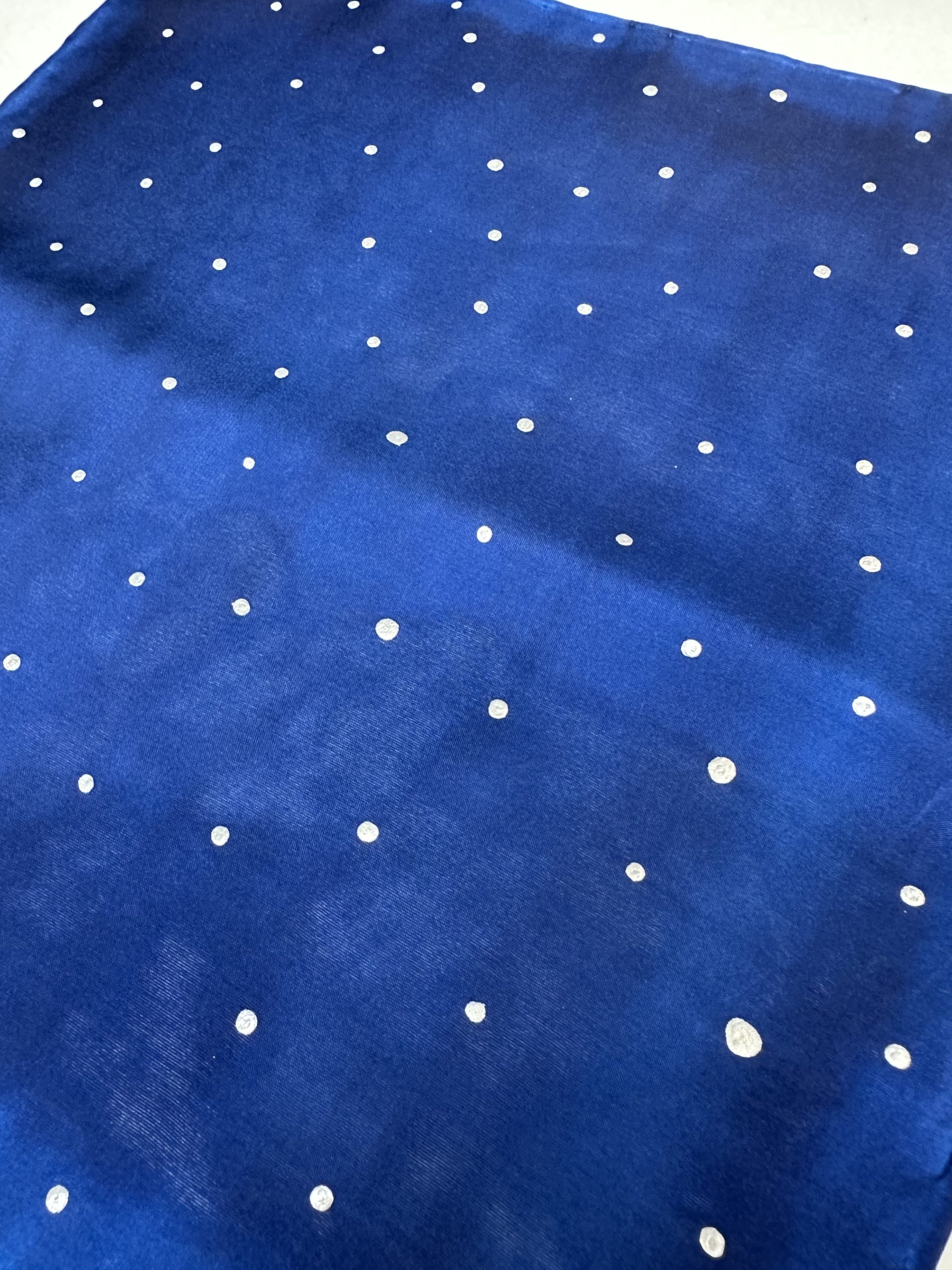 Cada pañuelo Estrellas Marino se pinta a mano con precisión y cuidado. Los puntitos plateados se aplican individualmente, logrando un equilibrio perfecto entre sobriedad y estilo. La seda natural garantiza suavidad, caída perfecta y durabilidad, ofreciendo un accesorio exclusivo y refinado. Cada pieza es única, resultado del tiempo y dedicación invertidos en su elaboración.