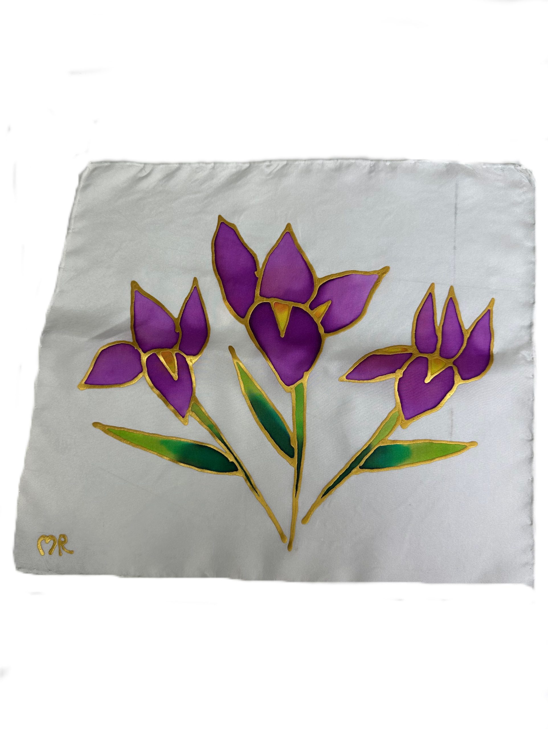 El pañuelo de seda Lirios lo hemos diseñado y pintado a mano de una manera muy delicada, respetando el color natural de la seda para el fondo y utilizando la técnica del difuminado en cada uno de los pétalos y jugando con distintos tonos de verde.