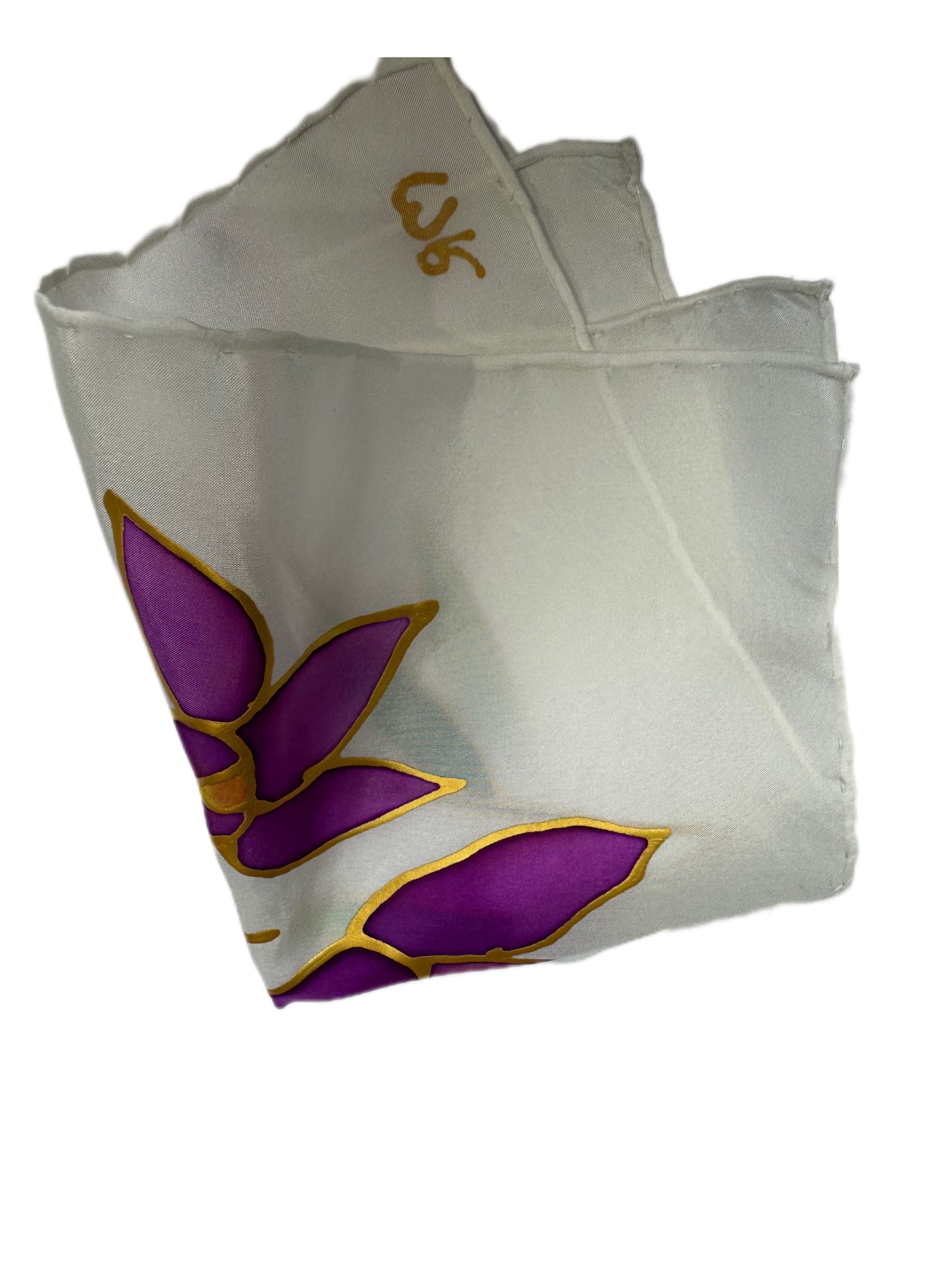 Añade un toque de elegancia y frescura a tu estilo con nuestro exclusivo pañuelo de seda natural pintado a mano. Este pañuelo único presenta un diseño sofisticado con un fondo blanco puro y lirios en los extremos, complementados por tallos y hojas verdes.