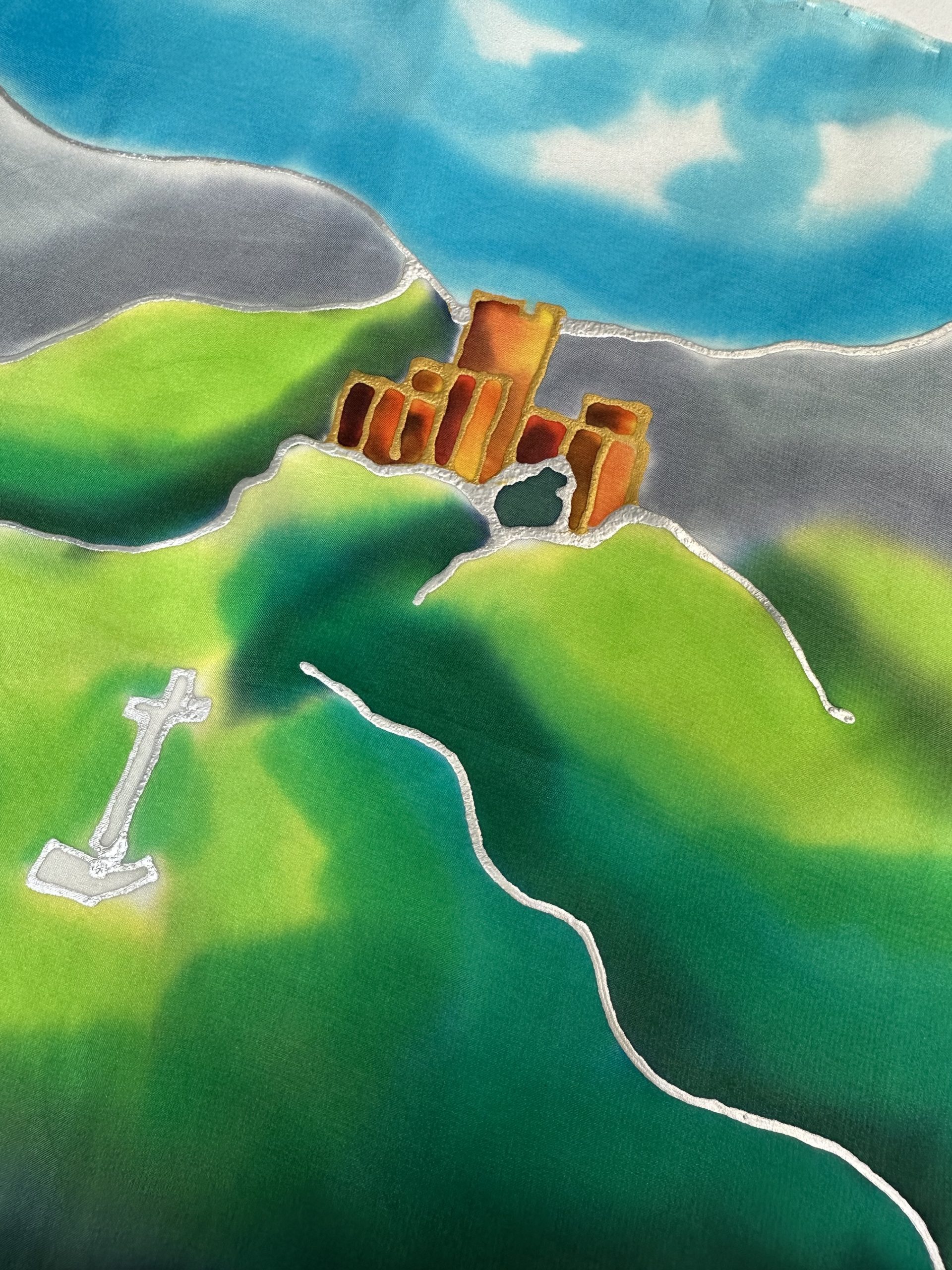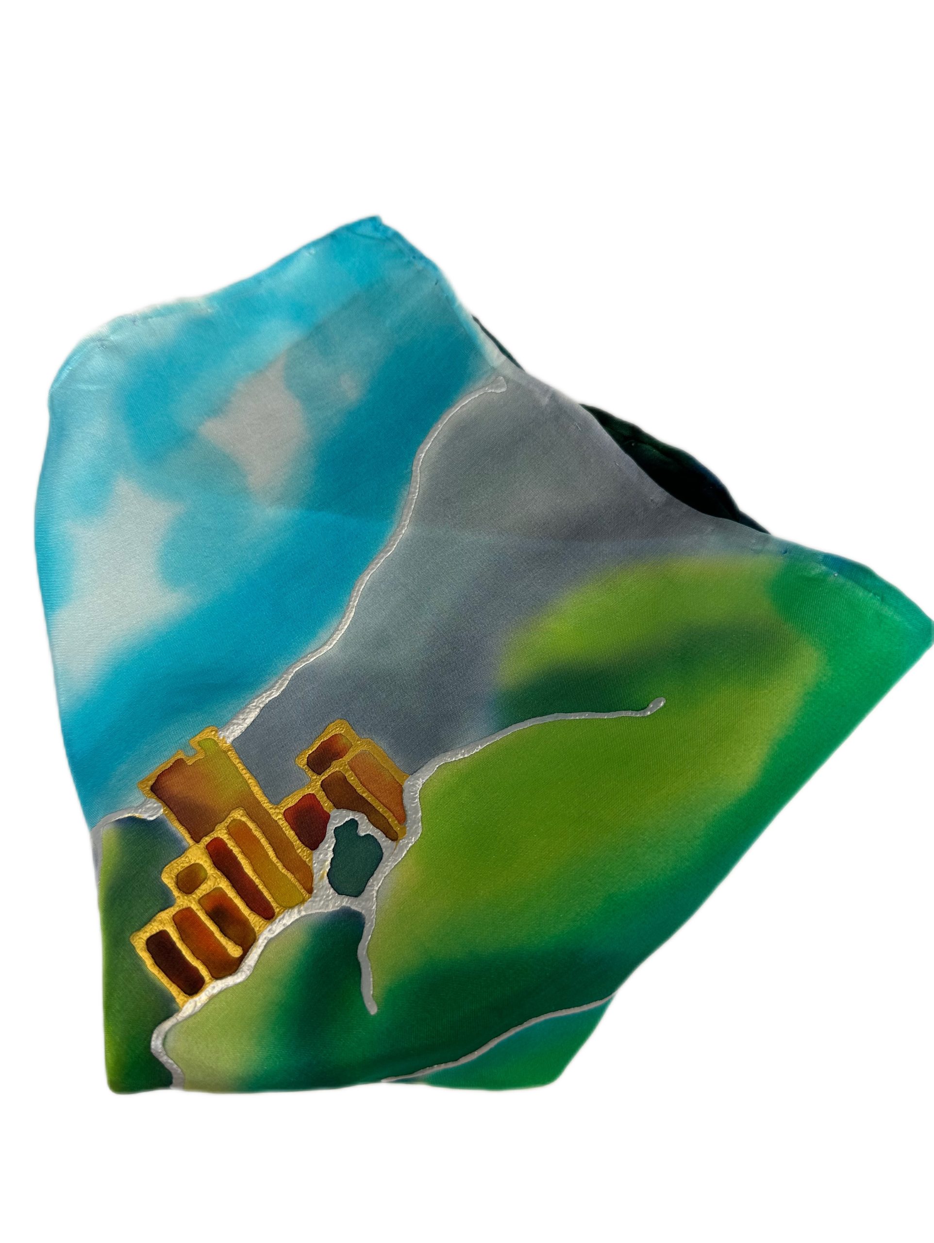El pañuelo de Seda «Castillo de Santa Catalina» lo hemos diseñado y pintado a mano con la intención de homenajear a nuestra Ciudad de Jaén. Por otro lado, el pañuelo tiene dibujado uno de los paisajes que vemos cuando observamos el castillo desde nuestra ciudad, rodeado de verde y con la cruz blanca en el lateral .